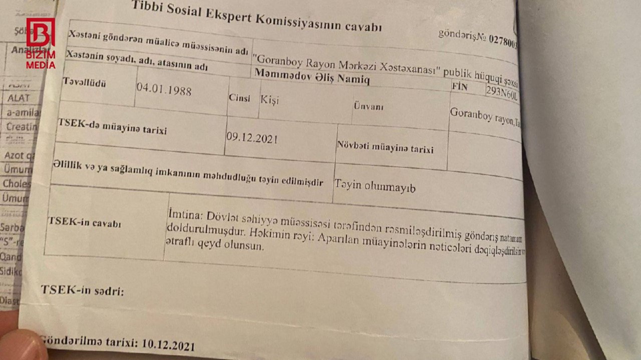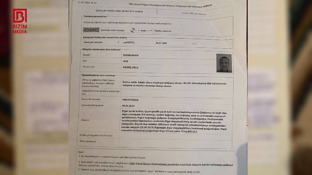 “Goranboy rayon sakini 1988-ci il təvəllüdlü Məmmədov Əliş Namiq oğlunun əlilliyinin qiymətləndirilməsi ilə bağlı son 1 il ərzində tibb müəssisəsi tərəfindən heç bir forma-88 göndərişi rəsmiləşdirilməyib. Belə olan halda isə əlilliyin qiymətləndirilməsi mümkün olmur. Bunun üçün vətəndaş qeydiyyat üzrə tibb müəssisəsinə yaxınlaşmalıdır. Tibb müəssisəsi tərəfindən Əliş Məmmədovla bağlı yeni forma-88 sənədi rəsmiləşdirildikdən sonra onun əlilliyi qanunvericiliyə uyğun olaraq təkrar qiymətləndirilə bilər”.