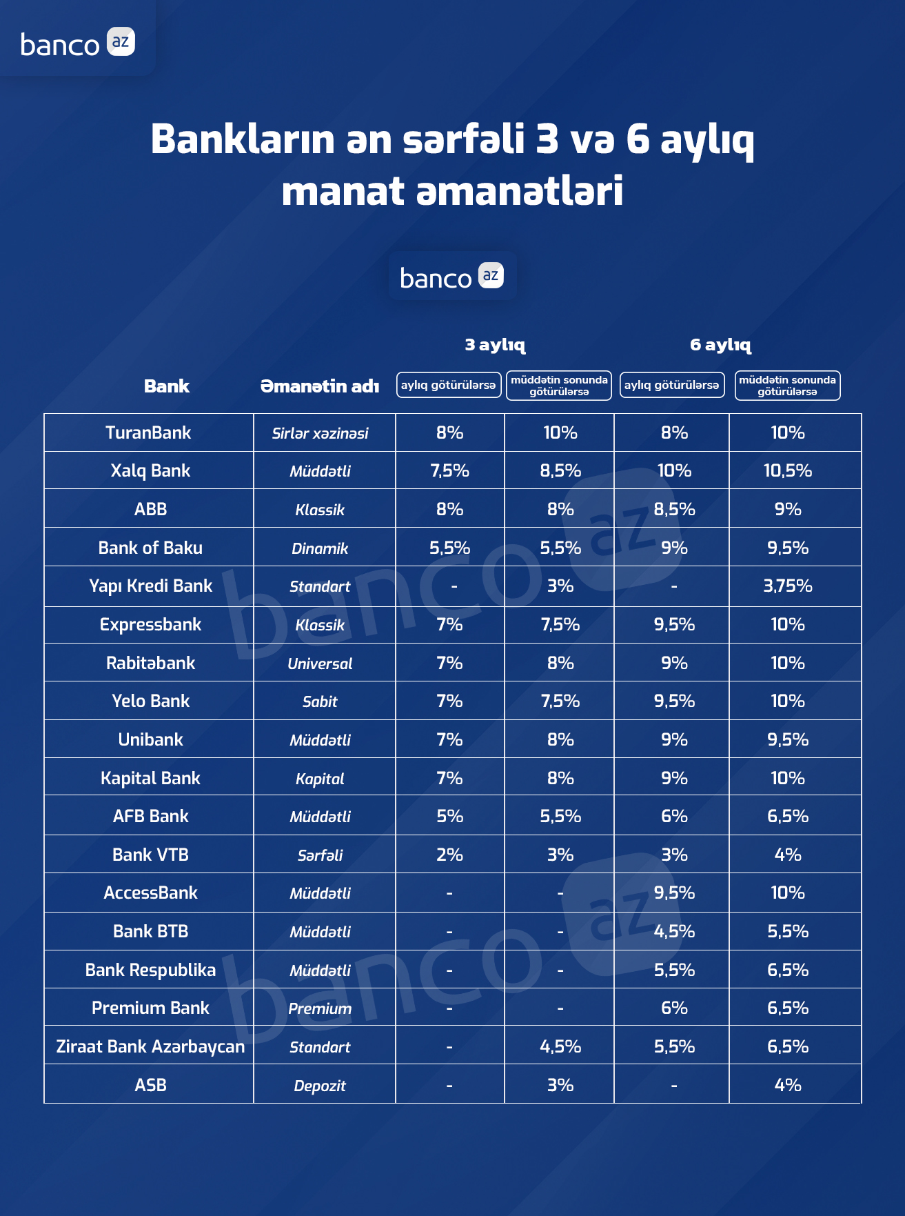 Banco.az bankların qısamüddətli depozitləri üzrə faiz dərəcələrini araşdırıb. 3 aydan 6 ayadək müddətə olan manat depozitləri üzrə ən yüksək faizləri Xalq Bank (10,5%) təklif edir. Daha sonra isə 10%-lə TuranBank, Accessbank, Kapital Bank, Rabitəbank, Expressbank və Yelo Bank gəlir.