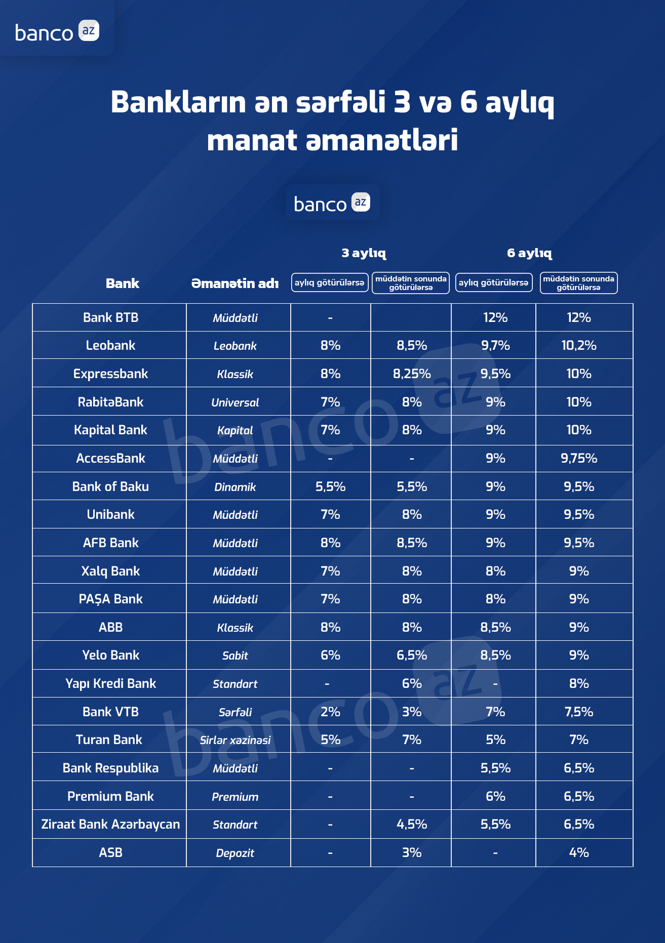 Banco.az bankların qısamüddətli depozitləri üzrə faiz dərəcələrini araşdırıb. 3 aydan 6 ayadək müddətə olan manat depozitləri üzrə ən yüksək faizləri Bank BTB (12%) təklif edir.