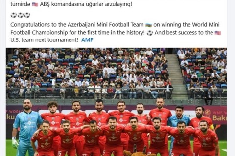 Paylaşımda öz komandalarını da unutmayıblar: "Azərbaycanın minifutbol milli komandasını tarixdə ilk dəfə minifutbol üzrə dünya çempionatının qalibi olması münasibətilə təbrik edirik! Növbəti turnirdə ABŞ komandasına uğurlar arzulayırıq!"