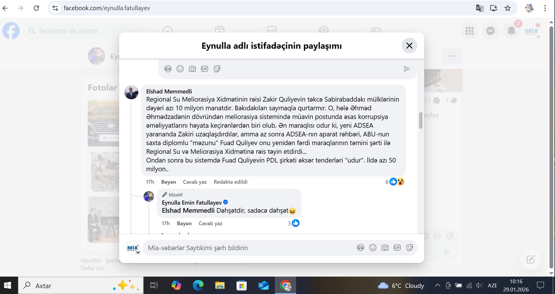 Mia.az xəbər verir ki, Elşad Məmmmədli diqqəti Dövlət Su Ehtiyatları Agentliyi (ADSEA) və onun tabeliyindəki xidmətlərdə cərəyan edən proseslərə, həmçinin Agentlik rəhbəri Zaur Mikayılovun qudası Fud Quliyevin diplom və himayəsində olduğu iddia olunan şirkətə çəkib:
