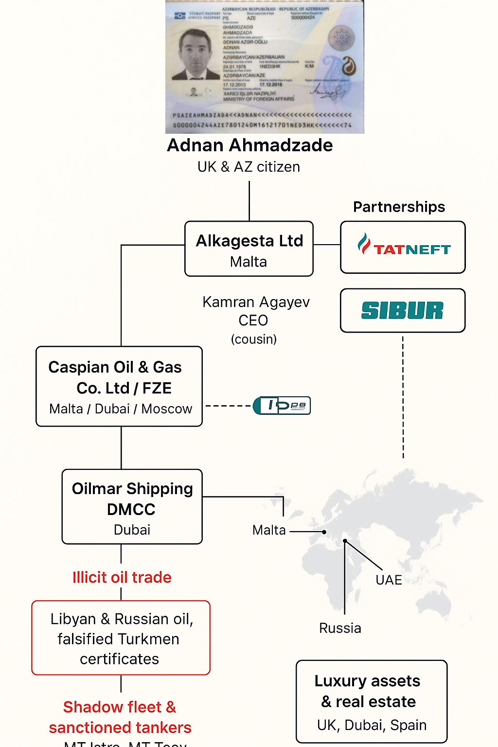 Lent.az-ın əldə etdiyi məlumata görə, Adnan Əhmədzadənin əmisi oğlu Kamran Ağayevə məxsus olan Alkagesta Maltanın ən böyük neft-bunker şirkətidir və Maltanın Birzebbuğa neft terminalından istifadə edərək rus neftini Rusiyanın “kölgə donanması” vasitəsilə daşıyır. Həmçinin BMT-nin embarqo qoyduğu Liviyadan neft ticarəti ilə məşğul olur.