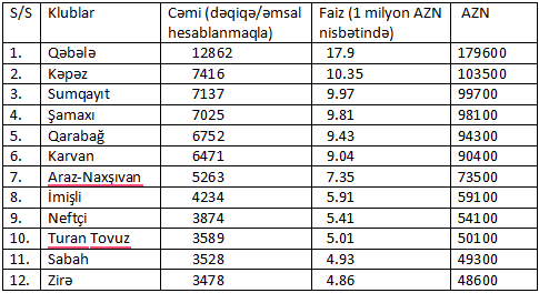 Bütün klubların yerli futbolçularının ümumi dəqiqə sayındakı faiz payına uyğun hesablamaya əsasən, sonuncu - 12-ci sırada "Zirə" qərarlaşıb. Başqa sözlə, "bonus fondu"ndan ən az pay alacaq klub qəsəbə təmsilçisi olacaq.
