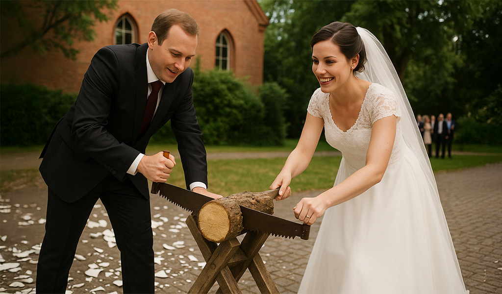 Almaniyada toy ərəfəsində qonaqlar adətən gəlinin evinin qarşısında keramika qabları qırır və cütlük qırıntıları təmizləyərək pis ruhları uzaqlaşdırır. Toy günü evli cütlüklər şans və bolluq rəmzi olan şam ağacının budaqlarından hazırlanmış yolda addımlayır və birlikdə bir kötüyü mişar ilə kəsirlər. Bu ritual onların həm bir-birinə inamını, həm də çətinliklərin öhdəsindən birlikdə gələ biləcəyini göstərir.