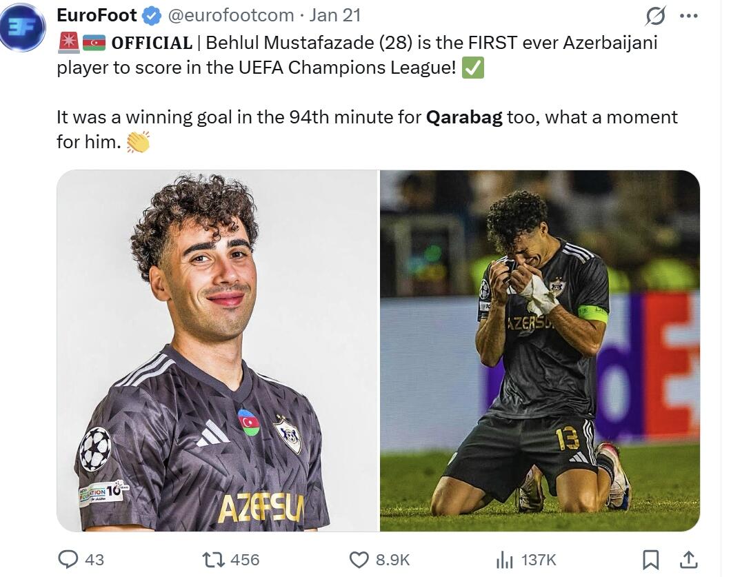 "Eurofoot": "Bəhlul Mustafazadə Çempionlar Liqasının əsas mərhələsində qol vuran ilk azərbaycanlı futbolçudur. 90+4 dəqiqədə vurulan qol həm də qələbə gətirdi". (Offsideplus.az)