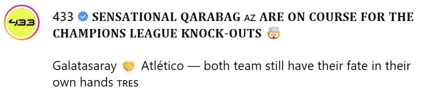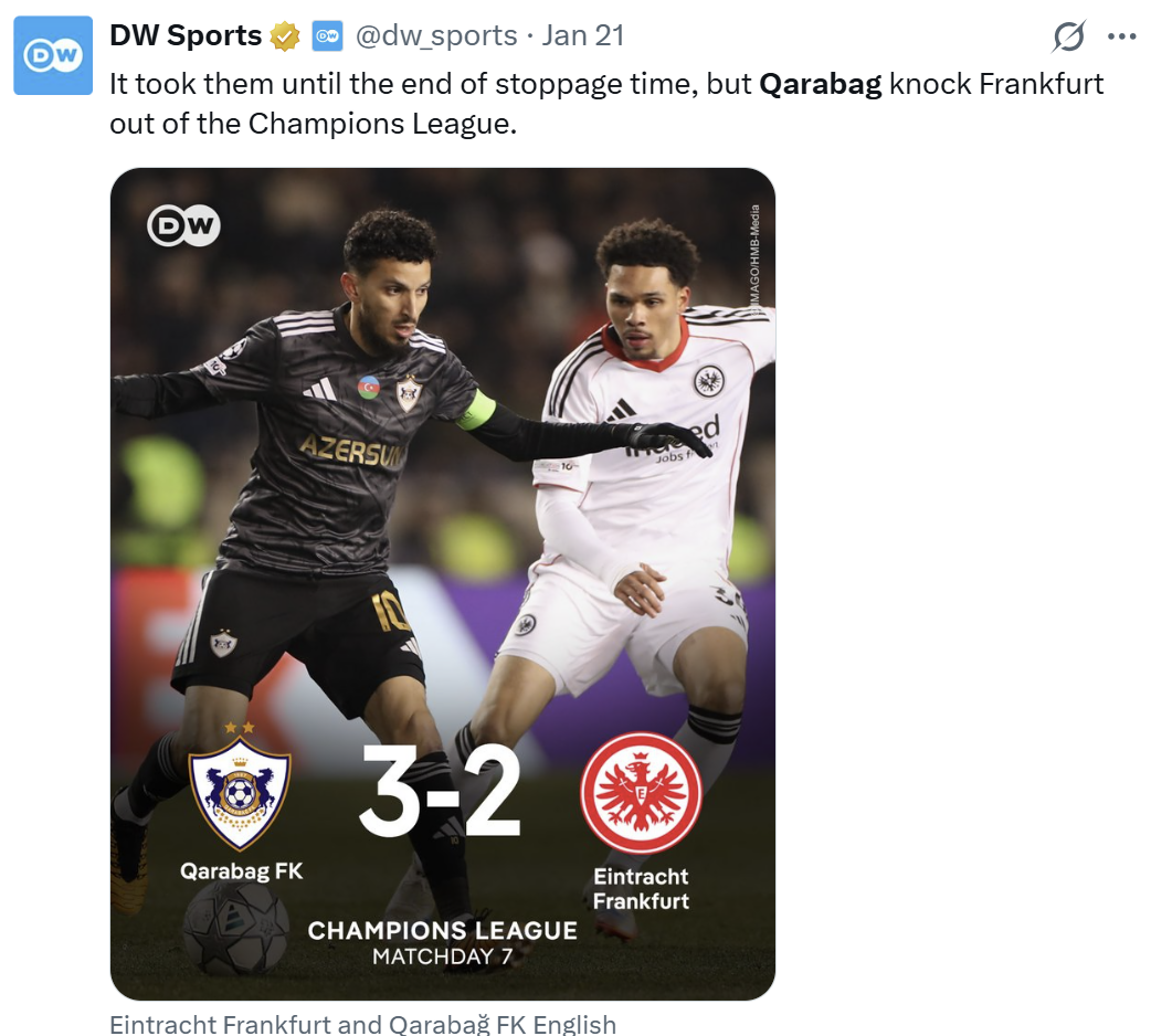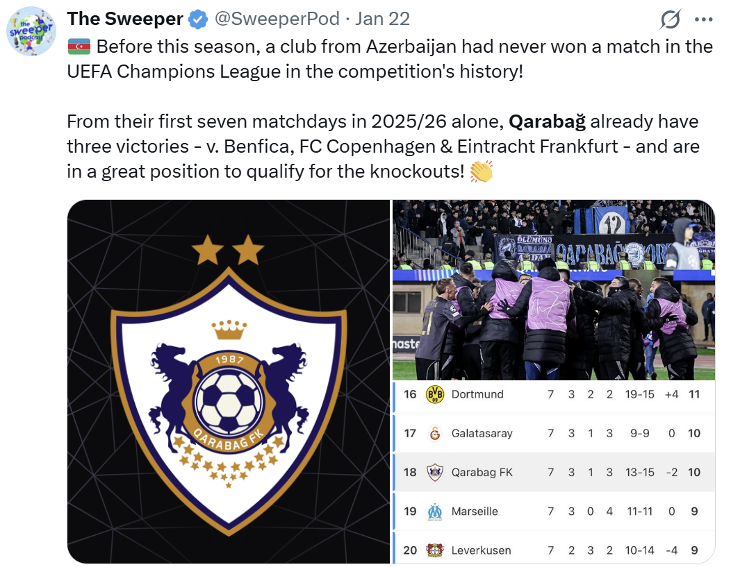 "The Sweeper": "Cari mövsümə qədər heç vaxt Azərbaycan klubu Çempionlar Liqasının əsas mərhələsində qələbə qazanmamışdı. "Qarabağ" 2025-26 mövsümündə keçirdikləri ilk 7 oyunda artıq 3 qələbə qazanıblar ("Benfika", "Kopenhagen" və "Ayntraxt" üzərində) və onlar pley-offa çıxmaq üçün əla yerdədirlər".