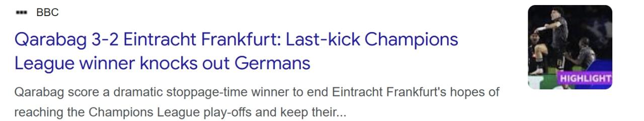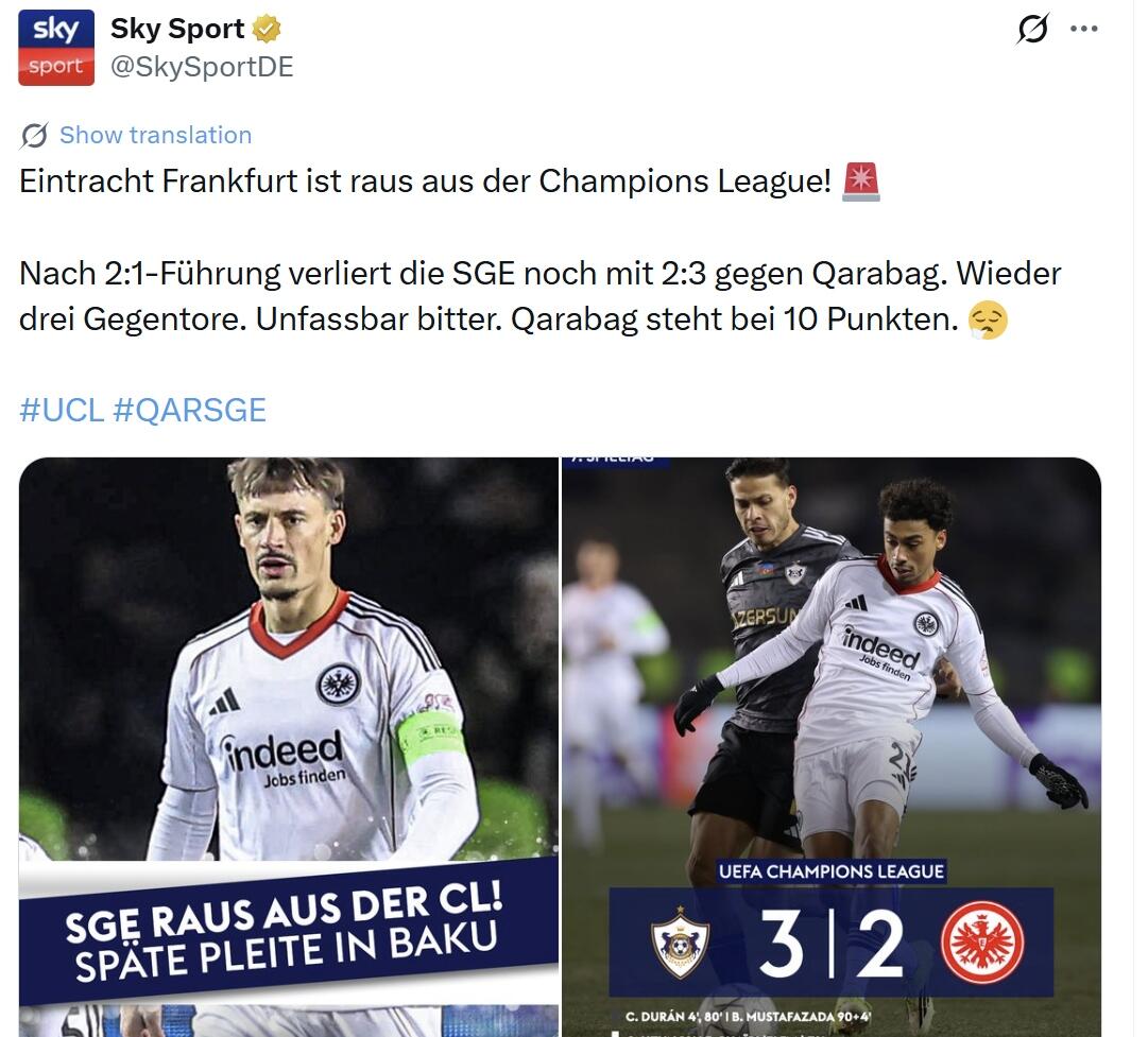 "Sky Sport": "Ayntraxt" Çempionlar Liqasında mübarizəni dayandırdı. 2:1 hesablı üstünlükdən sonra komanda "Qarabağ"a 2:3 hesabı ilə uduzdu. Yenə 3 qol vuruldu. İnanılmaz dərəcədə acıdır."Qarabağ" 10 xal toplayıb".