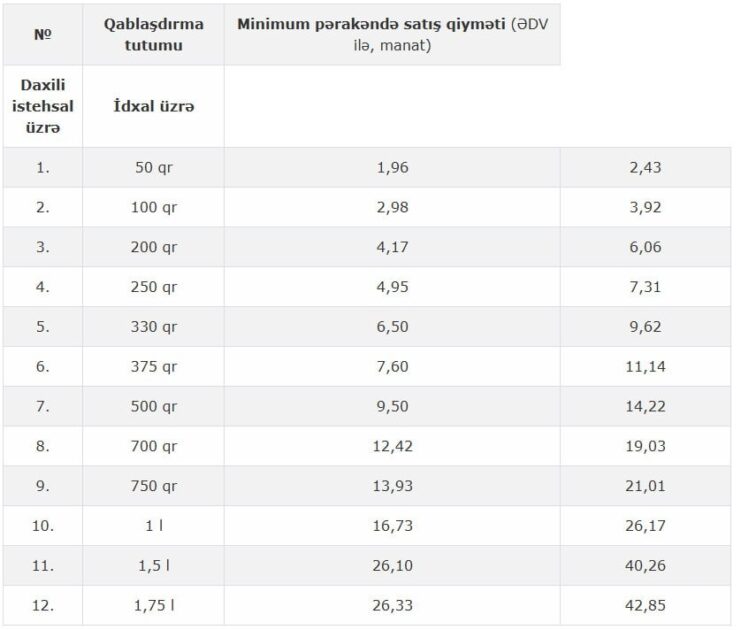 Qeyri-meyvə arağının pərakəndə satışının minimum qiymətləri aşağıdakı kimi təsdiq edilib: