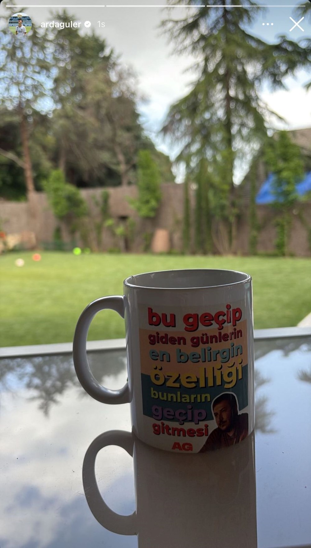Arda Gülerin paylaşımında məşhur “Gibi” serialının tanınmış repliqi yer alıb. Gülerin paylaşdığı fotoda göründüyü kimi, qəhvə fincanının üzərində serialdakı Yılmaz obrazının məşhur sözləri olan “Bu keçib gedən günlərin ən əsas xüsusiyyəti, onların keçib getməsidir” ifadəsi yer alıb.