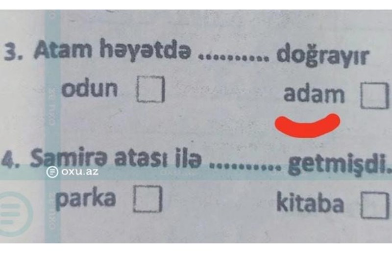 Narazılığa səbəb olan tapşırığın şərtində "Atam həyətdə … doğrayır" cümləsindəki üç nöqtənin yerini variant kimi verilmiş "odun" və "adam" sözlərindən biri ilə doldurmaq tələb olunur.