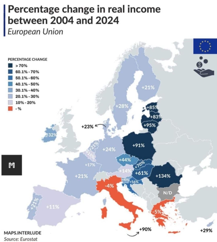 2004-2024-cü illər ərzində Avropa İttifaqı ölkələrində ev təsərrüfatlarında hər adama düşən real gəlir orta hesabla 22 faizə qədər artıb.