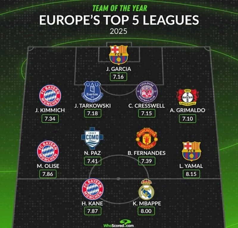 2025-ci il üçün Avropanın aparıcı 5 liqasının simvolik komandası açıqlanıb.