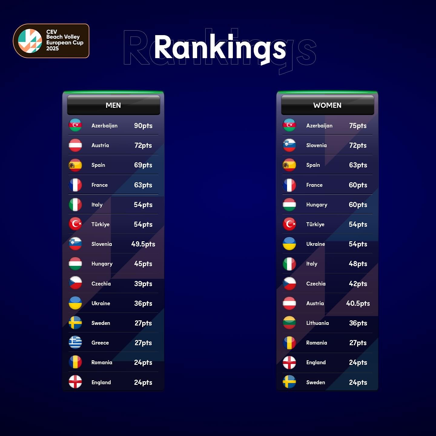 Avropa Voleybol Konfederasiyası çimərlik voleybolu üzrə klubların nəticələrinə görə ölkələrin reytinqini açıqlayıb.