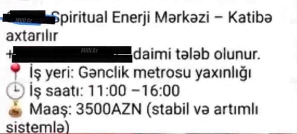 "Spiritual Enerji Mərkəzi" üçün yayılan vakansiya elanı sosial şəbəkələrdə geniş müzakirələrə səbəb olub. Katibə axtarıldığı bildirilən elanda əmək haqqı 3500 manat göstərilib.