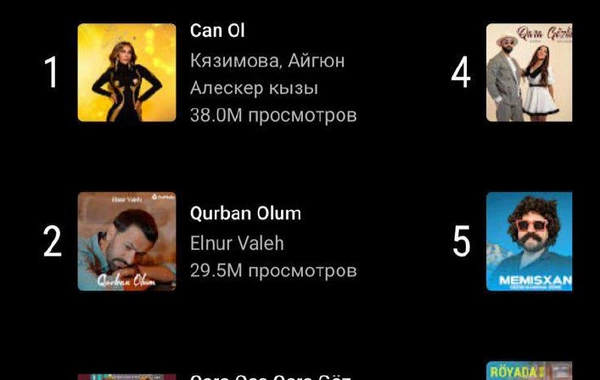 Bu siyahıda 1 illik dinlənmədə birinci yerdə Xalq artisti Aygün Kazımovadır. Ölkənin əsas ulduzunun "Can ol" mahnısı ilin ən çox dinlənilən ifası olub. Mahnı 38,1 milyon dəfə dinlənilib.
