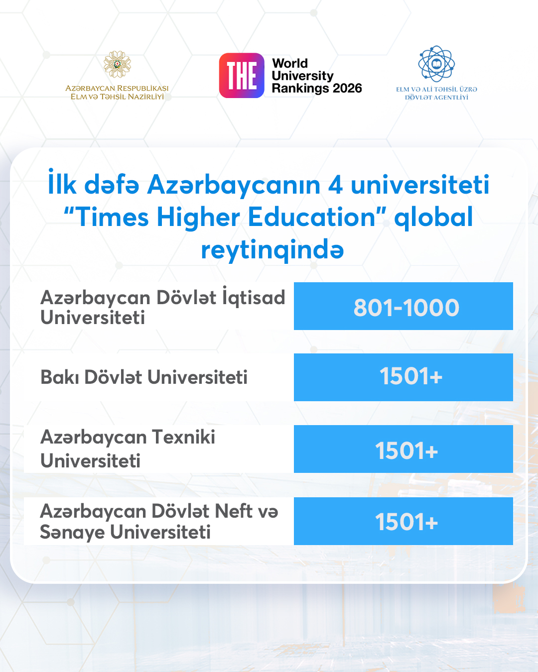 Ölkə tarixində ilk dəfə 4 universitetimiz "Times Higher Education” (THE) beynəlxalq reytinq agentliyi tərəfindən dərc olunan "Dünyanın ən yaxşı universitetlərinin reytinqi”nə (World University Rankings2026) daxil olub.