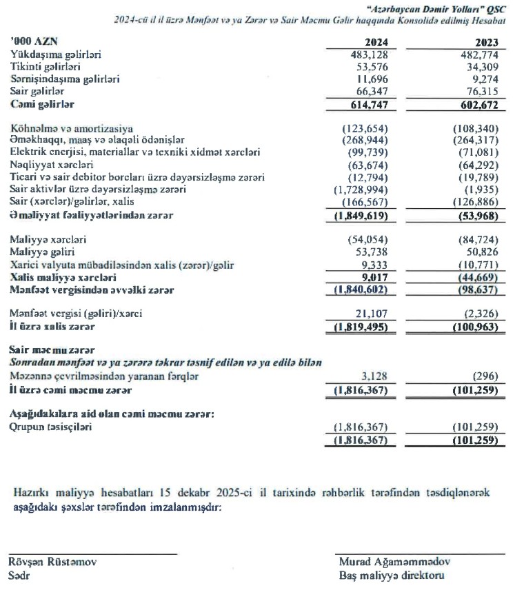 "Azərbaycan Dəmir Yolları" QSC (ADY) 2024-cü ili 1 milyard 819 milyon 495 min manat xalis zərər ilə başa vurub. QSC 2023-cü ili 100 milyon 963 min manat xalis zərər ilə bağlamışdı. Beləliklə, ötən il 2023-cü illə müqayisədə "Azərbaycan Dəmir Yolları"nın xalis zərəri 18 dəfə və ya 1 milyard 718 milyon 532 min manat artıb.