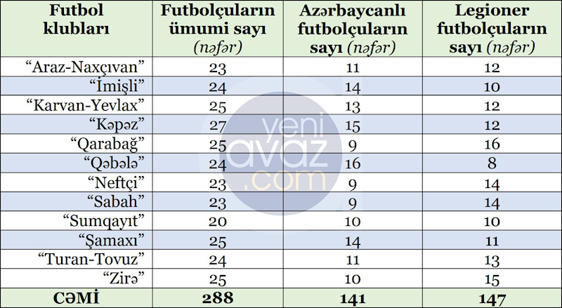 Cədvəldə Premyer Liqa klublarında azərbaycanlı və legioner futbolçuların sayı göstərilib: