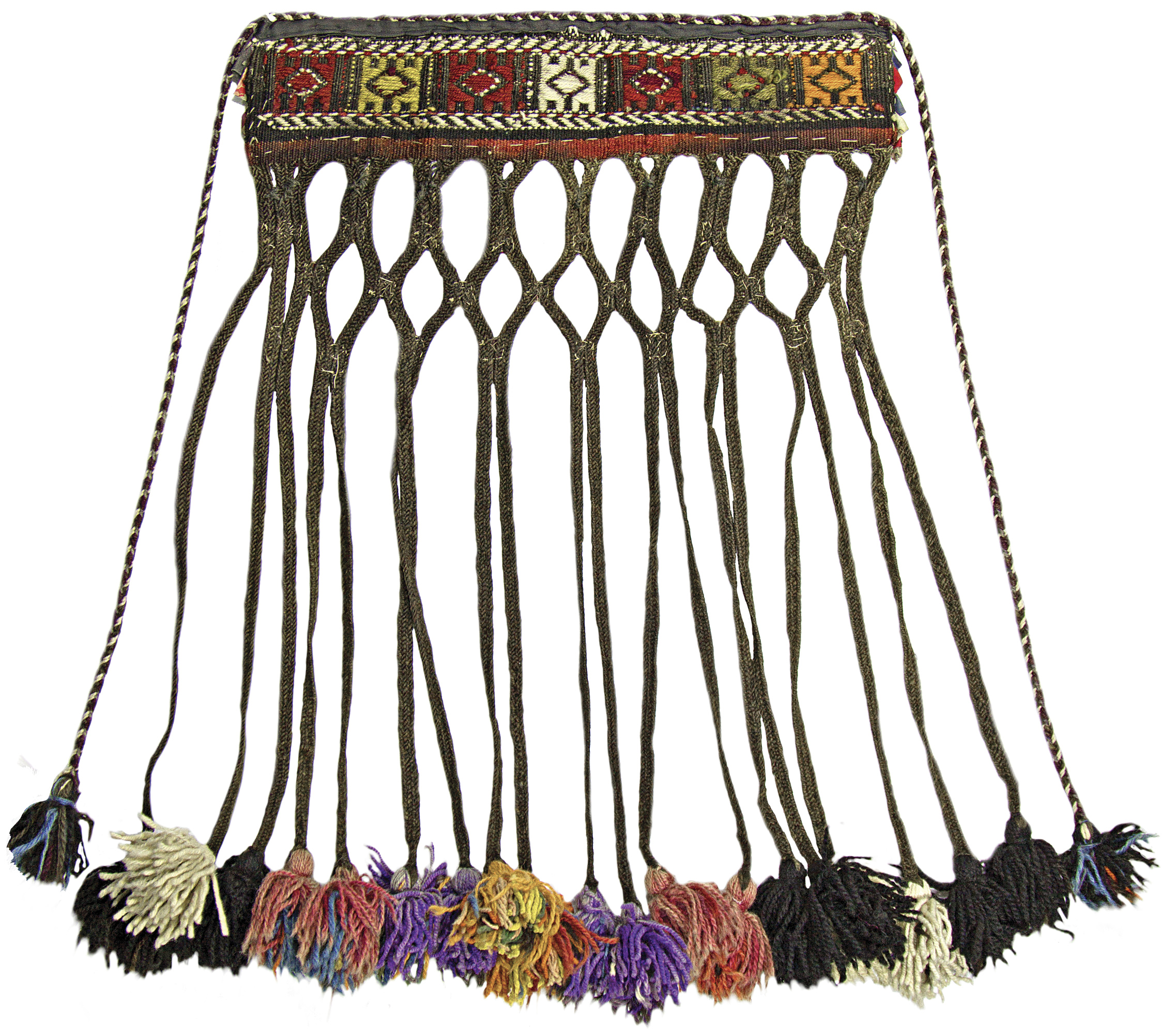 İkinci eksponat isə XX əsrin əvvəllərində hazırlanıb. Ölçüləri 37x80 sm olan bu nümunənin hazırlanmasında yun, at tükü, dəri, şüşə və kauri sədəflərdən istifadə olunub. Bəzək dolaşdırma və hörmə üsulu ilə hazırlanıb.