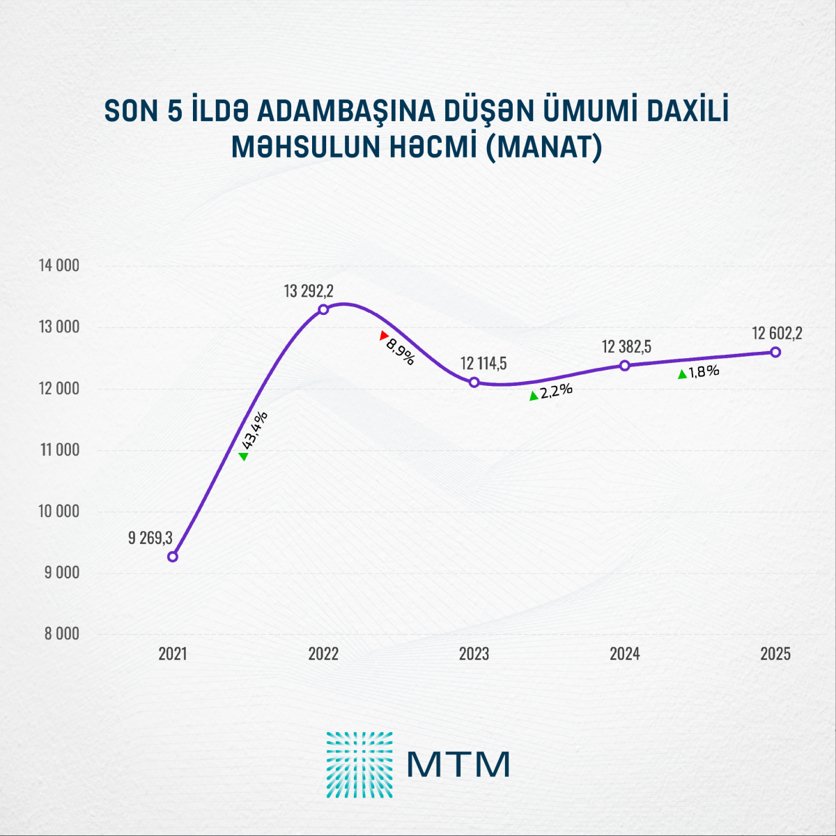 2025-ci ildə ölkə üzrə adambaşına düşən ümumi daxili məhsulun (ÜDM) həcmi əvvəlki illə müqayisədə 1,8 faiz və ya 219,7 manat artaraq 12 602,2 manat təşkil edib. Müqayisə üçün qeyd edək ki, 2024-cü ildə adambaşına düşən ÜDM 12 382,5 manat olub.