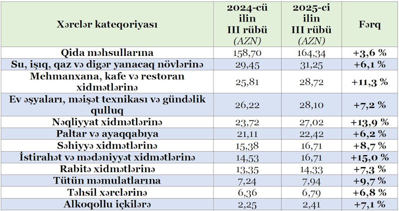 Aşağıdakı cədvəldə 2024 və 2025-ci illərin ilk 3 rübü ərzində qeydə alınan adambaşına düşən istehlak xərcləri və artım faizləri göstərilib: