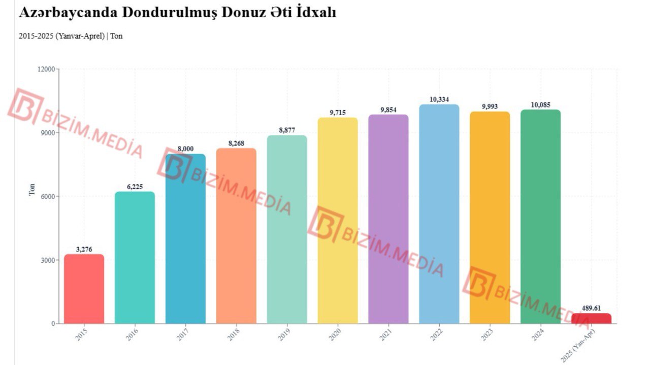 Bizim.Media Dövlət Statistika Komitəsinin məlumatlarına əsasən xəbər verir ki, son 10 il ərzində donuz əti idxalı 45 min ton artım qeydə alınıb.