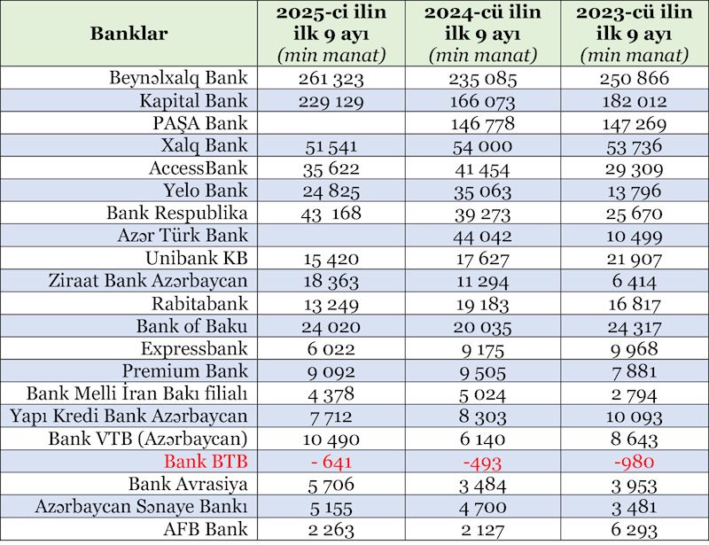 Ən yüksək mənfəəti dövlət bankı olan “Beynəlxalq Bank” əldə edib. Bu bankın ilin ilk 9 ayı ərzində xalis mənfəəti 261 milyon 323 min manat olub.