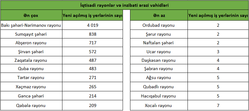 Azərbaycanda ən az iş yerləri harada açılıb? CƏDVƏL