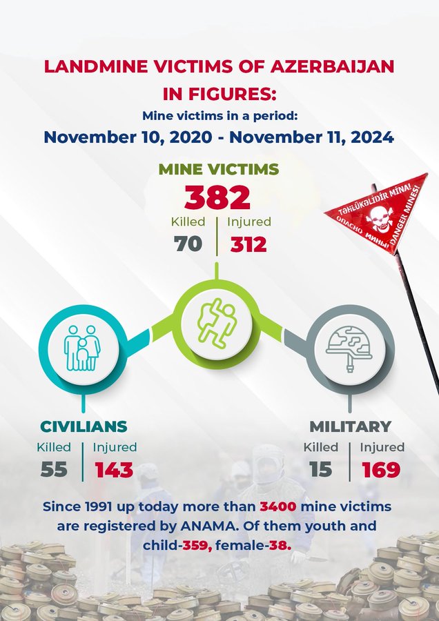 2020-ci ilin 10 noyabrından 2024-cü ilin 11 noyabrınadək 382 Azərbaycan vətəndaşı Ermənistanın hərbi işğalı dövründə basdırdığı minaların qurbanı olub.