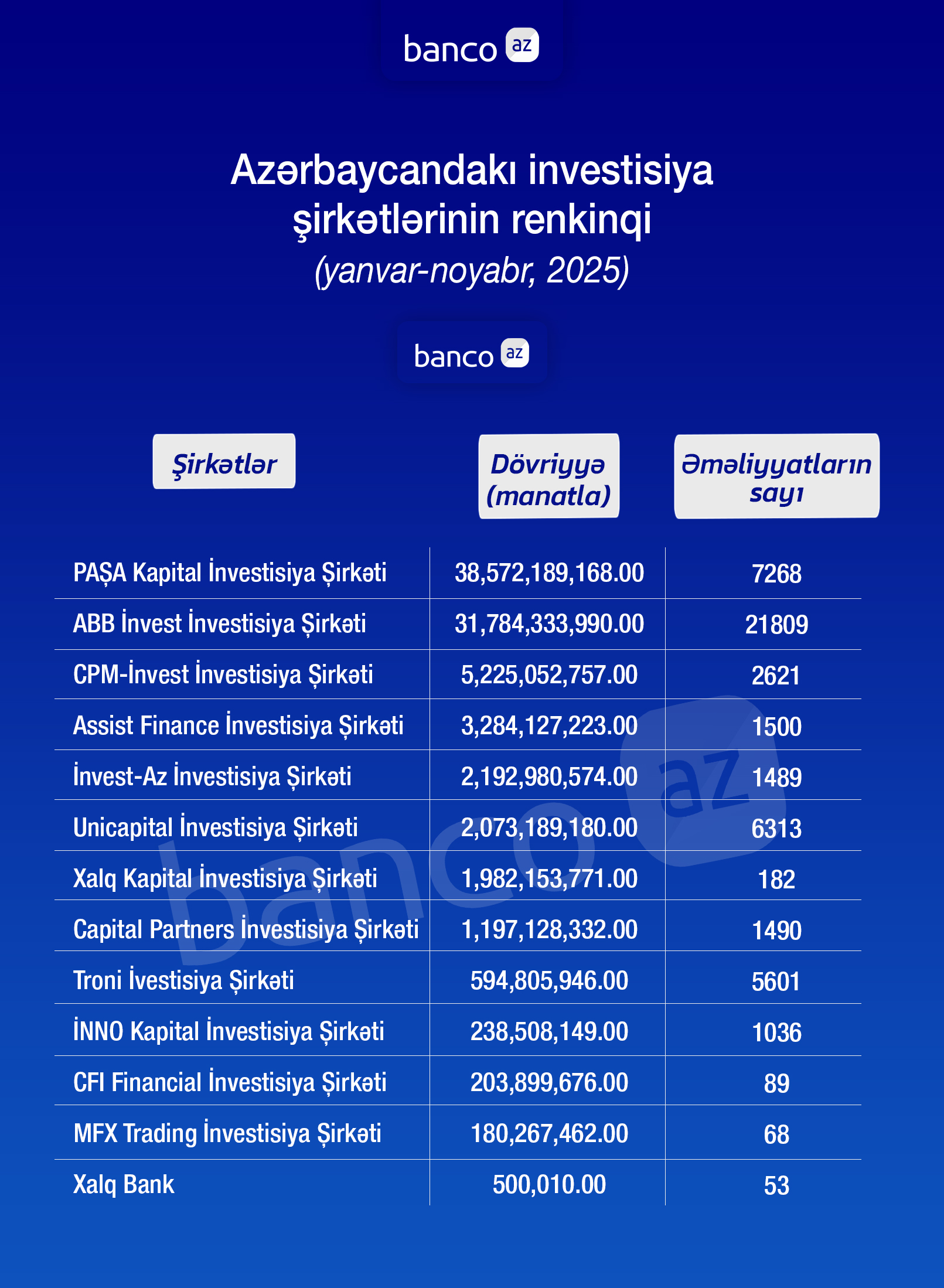 Azərbaycandakı investisiya şirkətlərinin renkinqi (Yanvar noyabr, 2025)