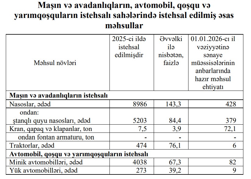 Dövr ərzində əvvəlki illə müqayisədə traktorların istehsalı 23,9 faiz azalaraq 474 ədəd, yük avtomobillərinin istehsalı isə 60,8 faiz azalaraq 273 ədədə düşüb.