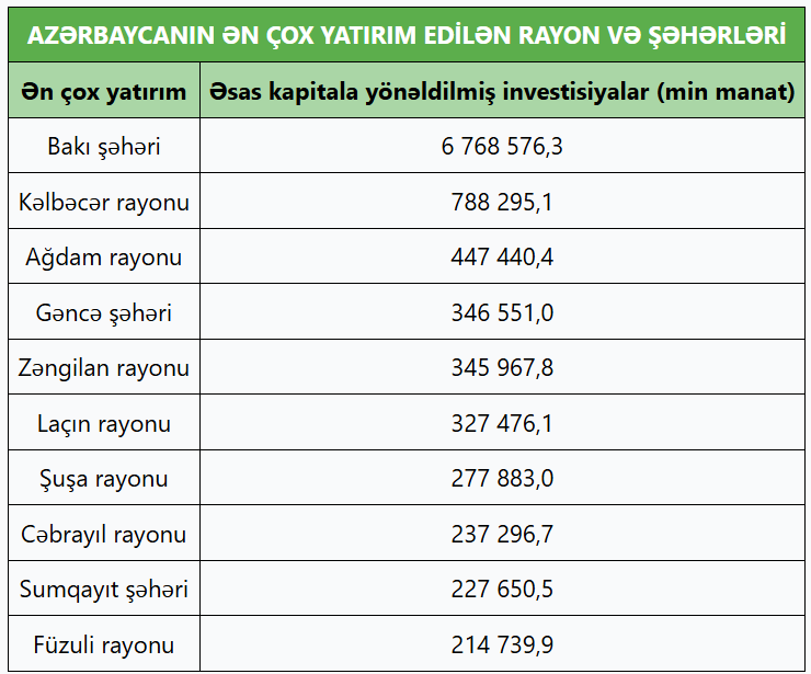 Azərbaycanın ən çox yatırım edilən rayon və şəhərləri (SİYAHI)