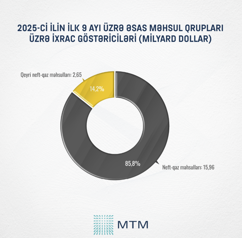2025-ci ilin yanvar-sentyabr aylarında Azərbaycanın ixrac həcmi 18,61 milyard dollar təşkil edib ki, bu da ötən il eyni dövrünə nisbətən 6,3% və ya 1,25 milyard dollar azdır.