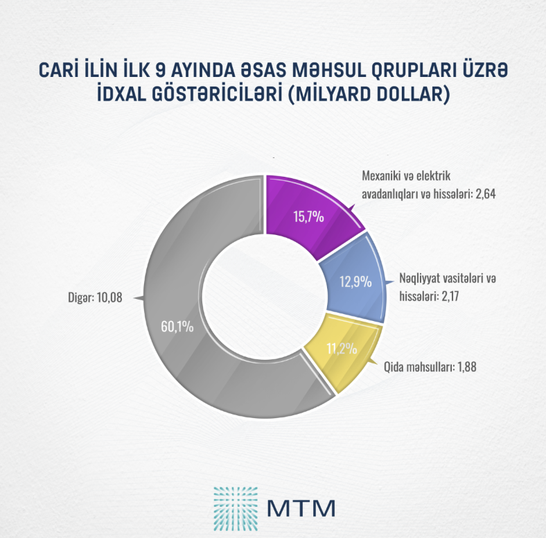 İdxalın qalan 60,1%-i digər məhsullardan formalaşıb. Onların da ümumi həcmi 10,08 milyard dollar təşkil edib.
