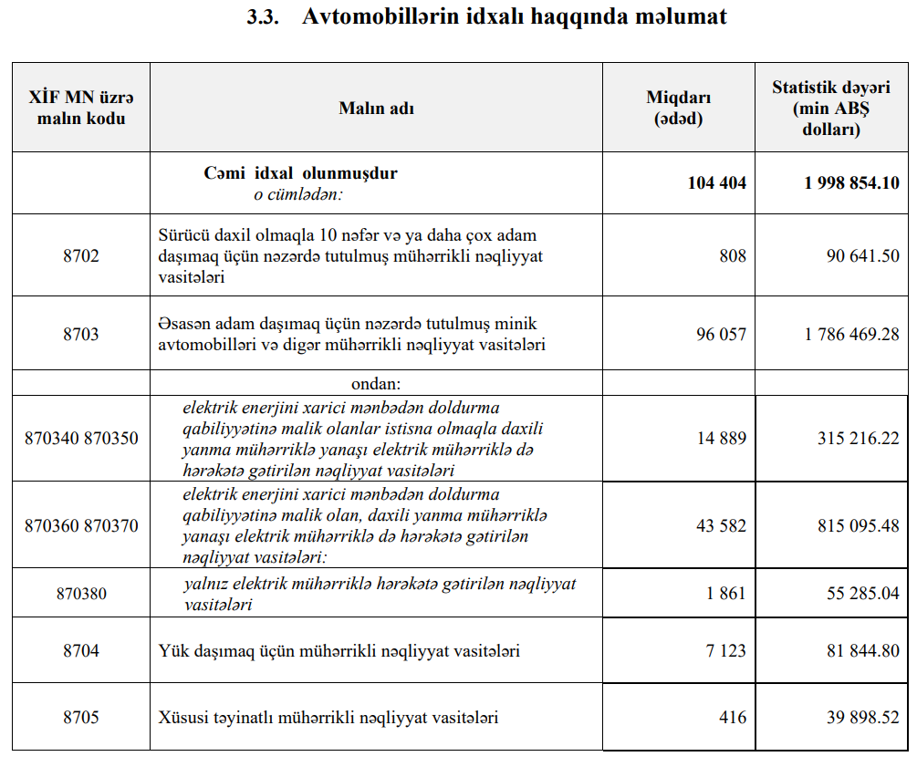 Müqayisə üçün qeyd edək ki, 2024-cü ilin 11 ayı (yanvar-noyabr) ərzində Azərbaycana 1 milyard 673 milyon 214 min dollar dəyərində 82 min 926 ədəd avtomobil idxal edilmişdi.