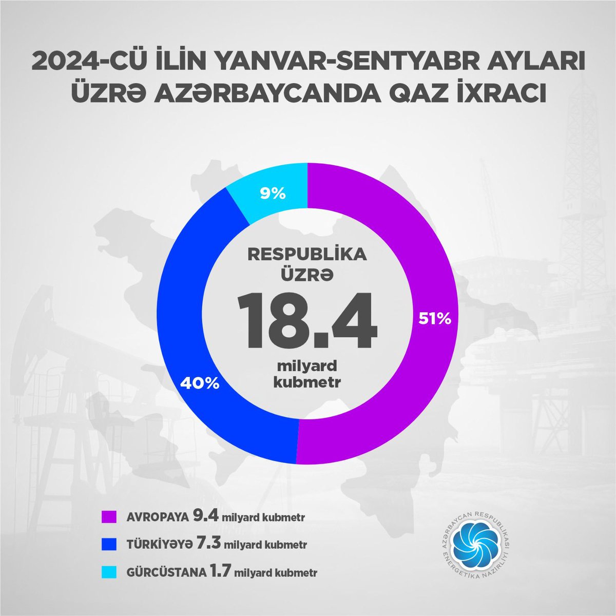 Yanvar - sentyabr aylarında Avropaya təxminən 9,4 milyard kubmetr, Türkiyəyə 7,3 milyard kubmetr, Gürcüstana isə 1,7 milyard kubmetr qaz ixrac olunub.