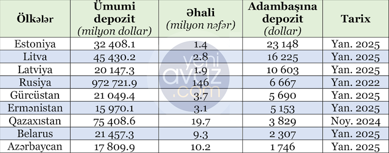 Baltik ölkələri regionda ən yüksək göstəricilərə malikdir. Belə ki, Latviyada adambaşına düşən depozit 10 min 603 dollar, Litvada 16 min 225 dollar, Estoniyada isə 23 min 148 dollar təşkil edib.