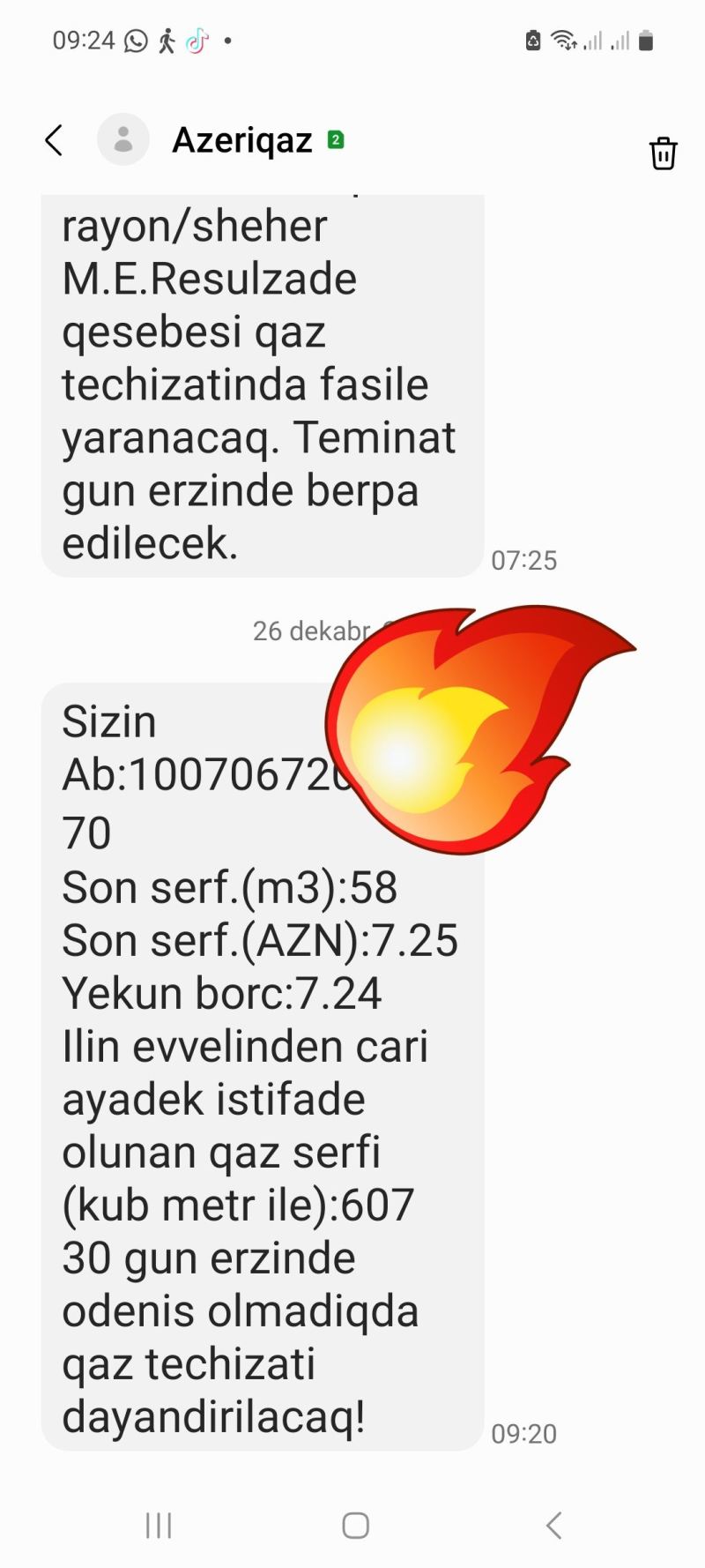 "4 noyabr tarixində "Azəriqaz" mənzilimə yeni sayğac quraşdırdı. Köhnə sayğacda cəmi 4073 kub maye qaz sərfiyyatı olmuşdu, gəlib dəyişdilər. Smart sayğacda 308 kub qalıq vardı, aktda yazdılar və dedilər ki, bu qalıq qurtarana qədər sizə borc yazılmayacaq. Bu gün mənə 23 kub maye qaz sərfiyyatı üçün qəbz veriblər. Özü də 4 manat 75 qəpik. İndi bunlara nə deyəsən? Bu Azəriqaz İB-yə kim rəhbərlik edir? O nəyə və kimə arxayındır ki, istehlakçının cibinə girir? Onsuz da yeni sayğac əvvəlkinə nisbətən ikiqat sərfiyyat hesablayır. SOCAR-da bu biabırçılığa nəzarət edən kimsə var? Varsa zəhmət olmasa düzəliş edin. Aktda göstərilməsinə baxmayaraq sayğacın şəkilini də çəkdim. Şərh hissəsində qalığı göstərən şəkili də yerləşdirəcəm"