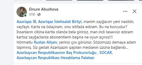 E.Abışova feyzbuk hesabında bunları yazıb: " Azəriqaz İB mənim sayğacım yeni nəsildir, "vayfaylı"dır. Karta nə ödəyirəm, onu istifadə edirəm. Bu nə borcdur? İnsanların cibinə kartla olanda belə girirsiz, mən indi təsəvvür edirəm kartsız sayğaclarda abonentlərin başına nə oyun açırsız!".