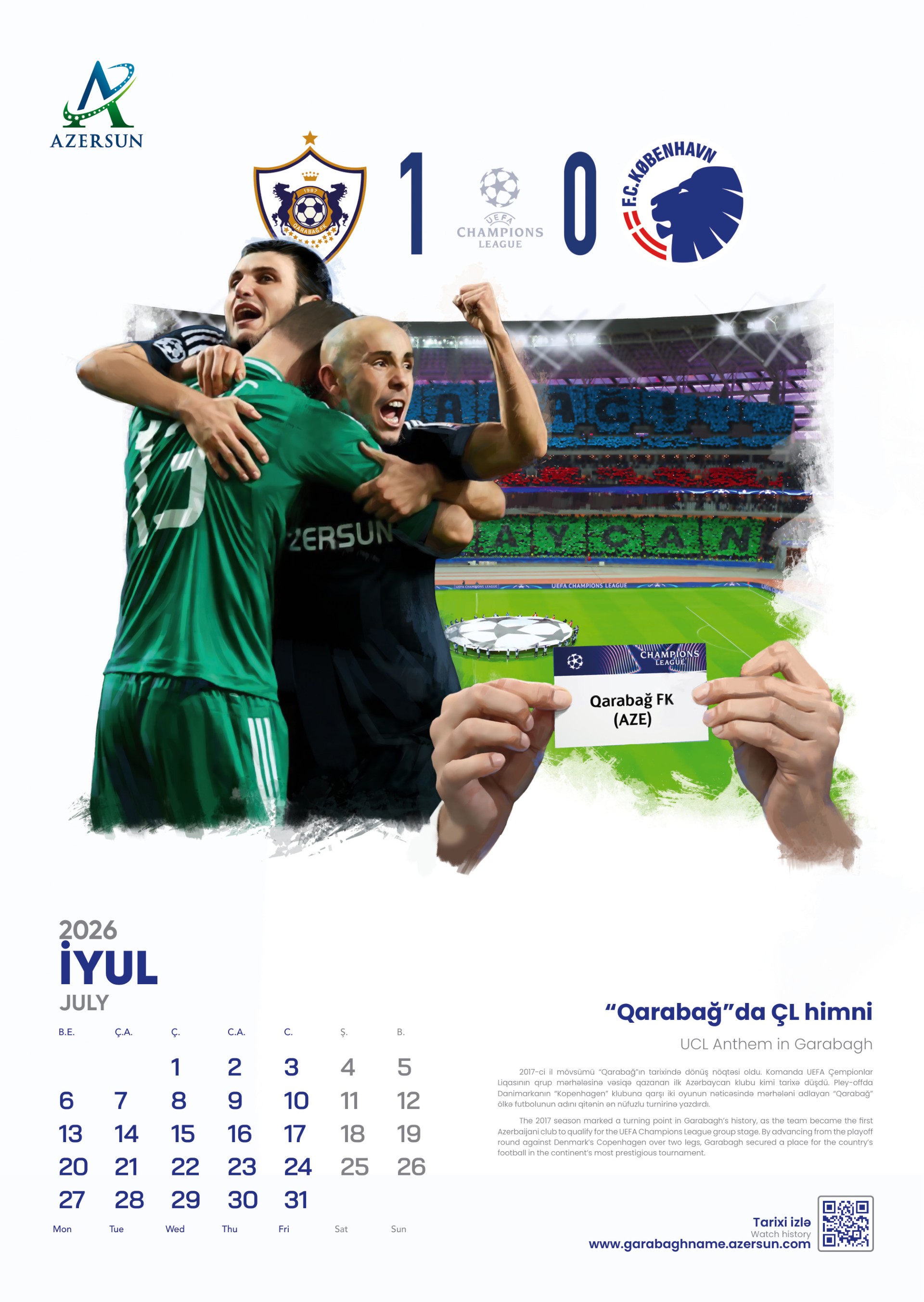 “Qarabağın İmarəti” başlığı ilə başlayan təqvimdə klubun formalaşma mərhələləri əks etdirilir, Allahverdi Bağırovun baş məşqçi kimi fəaliyyəti, 2001-ci ildə “Azərsun Holdinq”in “Qarabağ”ı himayəsinə götürməsi oxucuya çatdırılır. Təqvimdə həmçinin holdinqin ədəbi qurucusu mərhum Abdolbari Gozalın klubun fəxri prezidenti olması, “Qarabağ”ın əfsanəvi futbolçuları, eləcə də komandanın ölkə daxilində və beynəlxalq arenada qazandığı tarixi qələbələrdən bəhs olunur.