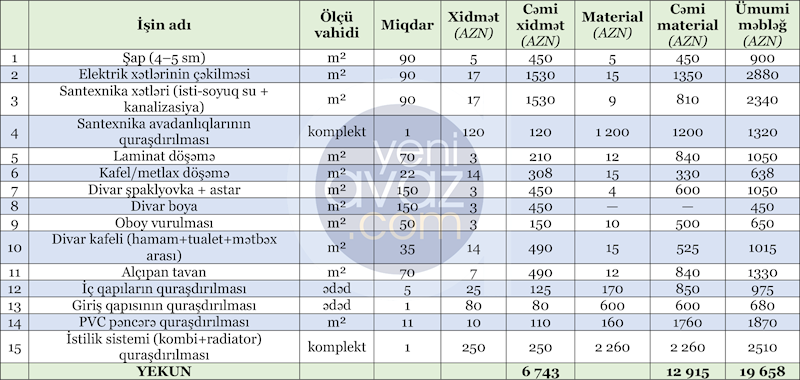 Apardığımız hesablama göstərir ki, 90 kvadratmetrlik 3 otaqlı mənzilin təmiri üçün xidmət (usta) haqqı olaraq 6 743 manat, materiallar üçün isə 12 915 manat vəsait lazımdır. Nəticədə tam təmirə görə 19 658 manat xərclənməlidir.