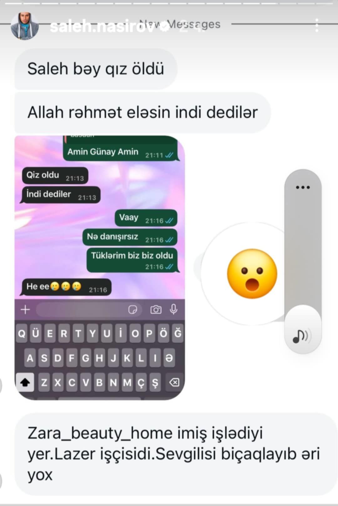 Laçın Ticarət Mərkəzi yaxınlığında, Bəhruz Nuriyev 24 A ünvanında yerləşən "Zara Beauty Home" gözəllik salonunun işçisi olduğu bildirilən qadın bıçaqlanaraq öldürülüb.