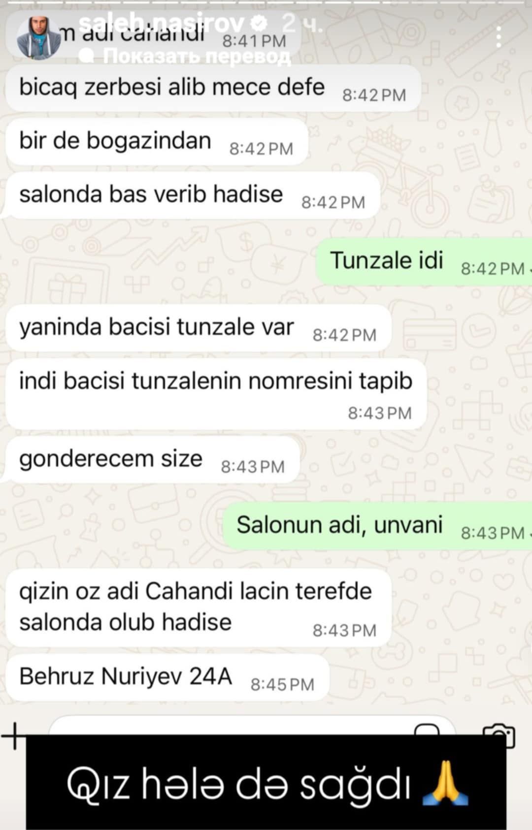 Adının Cahan olduğu bildirilən qadının salonda sevgilisi tərəfindən boğazının bıçaqla kəsildiyi və dərhal xəstəxanaya çatdırıldığı qeyd olunub.