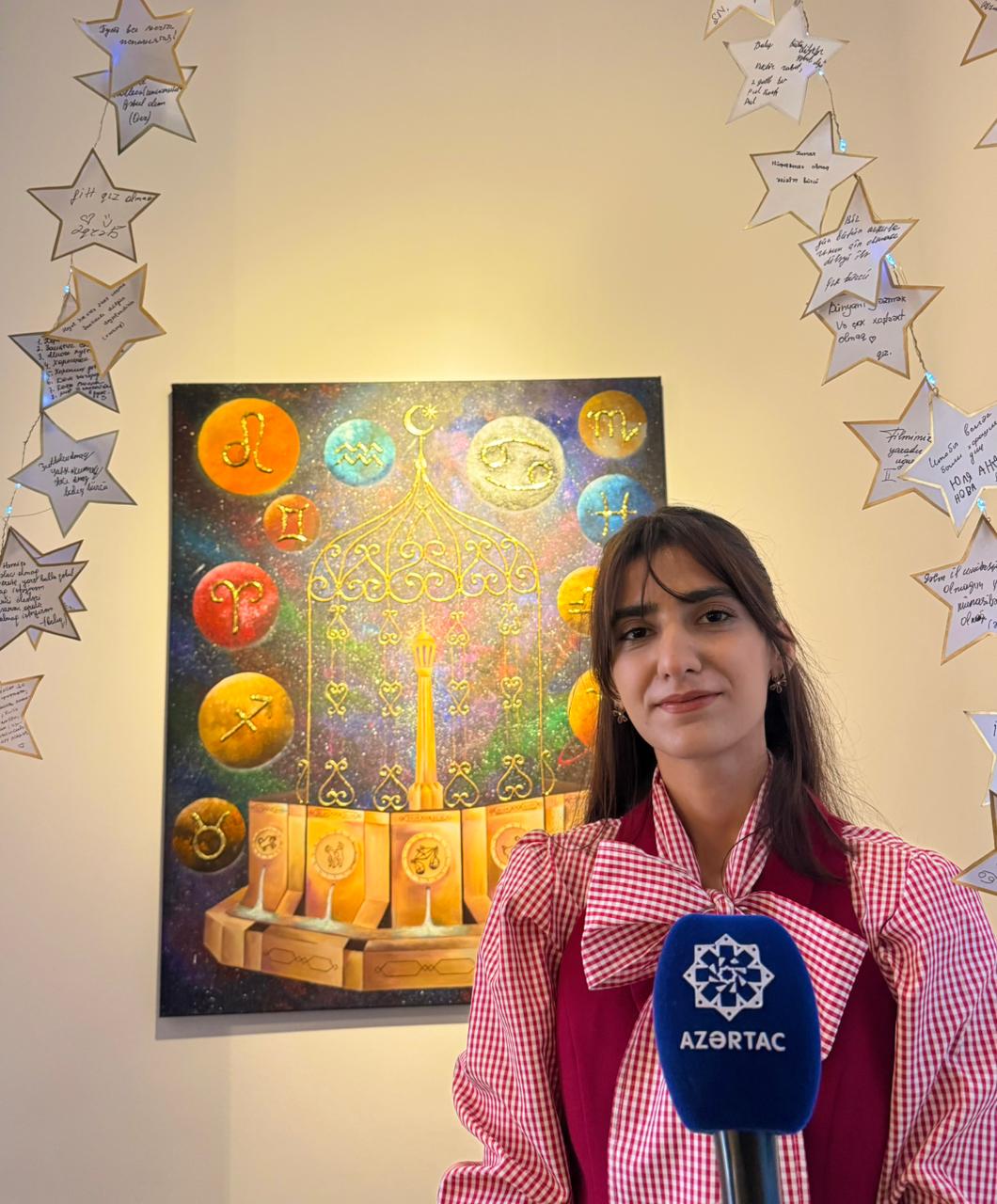 Rəssam Günel Cəfərova bildirib ki, əsərində fəvvarələri bürclərlə əlaqələndirib: “Fikrimcə, hər bir insan öz bürcünün xüsusiyyətlərini daşıyır. Mən də bu ideyanı fəvvarələr vasitəsilə ifadə etdim. “Bürc fəvvarəsi” bizi yansıdan su axını kimi tərtib olunub – su daim hərəkətdədir, dəyişir, amma mahiyyətcə eyni qalır. İnsanlar arzularını suya söyləyir, çünki suyun yaddaşı var. O buxarlanaraq kainatla birləşir və bəzən arzular elə həmin axınla gerçəkliyə qovuşur”.