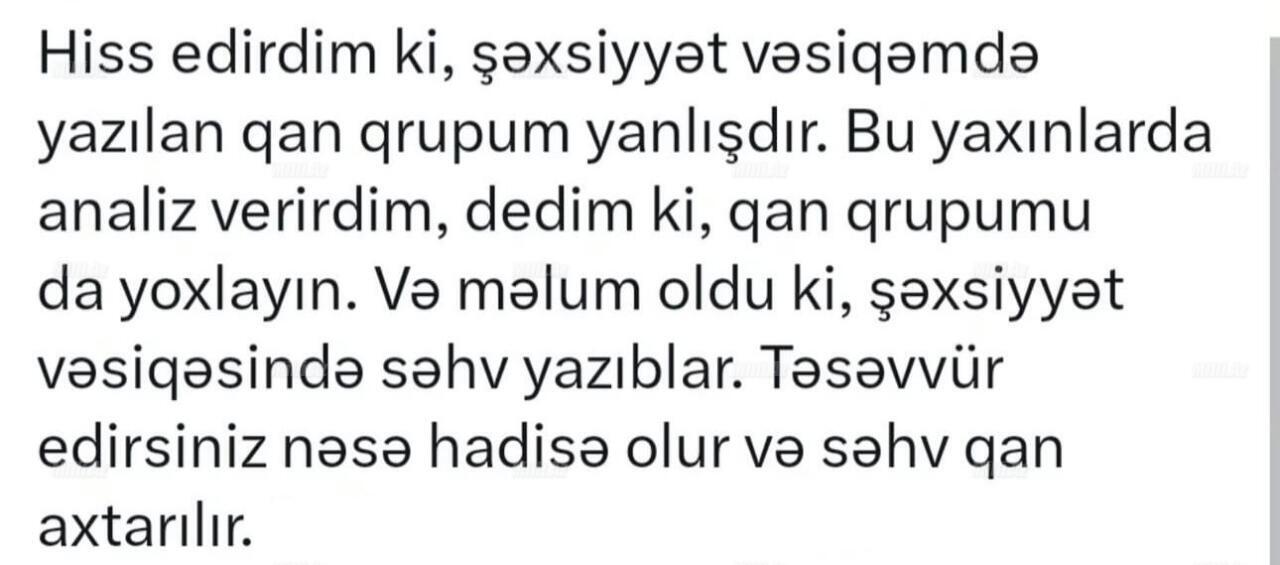 Vətəndaş bildirib ki, yaxın vaxtlarda analiz zamanı şəxsiyyət vəsiqəsində göstərilən qan qrupunun yanlış olduğu müəyyənləşib. O, bu halın ciddi risklər yaratdığını, hansısa hadisə baş verdikdə səhv qan köçürülməsinin insan həyatı üçün təhlükə yarada biləcəyini vurğulayıb.