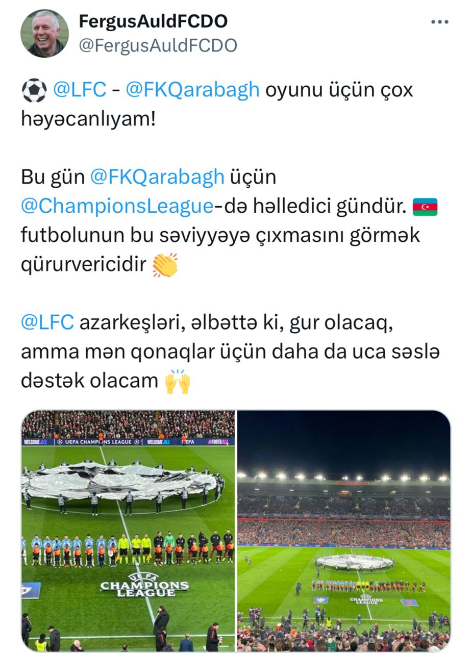 "Liverpul" - "Qarabağ" oyunu üçün çox həyəcanlıyam! Bu gün "Qarabağ" Çempionlar Liqasında həlledici gündür. Azərbaycan futbolunun bu səviyyəyə çıxmasını görmək qürurvericidir.