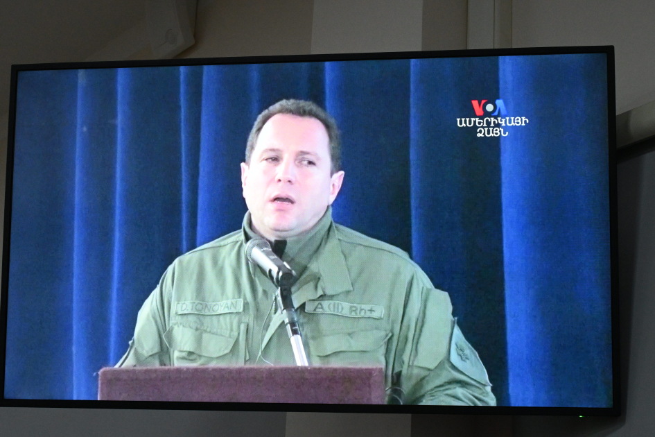 Nyu-Yorkda BMT-də mülki geyimdə, axşam isə Ermənistan icması nümayəndələri ilə görüşdə hərbi formada çıxış edən David Tonoyan Ermənistan ordusunda həyata keçirilən və keçiriləcək işlər barədə danışıb, bu işdə diasporun rolundan bəhs edib və deyib: “Mən özüm və Ermənistan silahlı qüvvələri - biz ianə məsələlərindən çox da məmnun deyilik”.