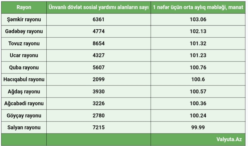 Ən çox dövlət ünvanlı sosial yardım alan 10 rayon aşağıdakı cədvəldə qeyd olunub: