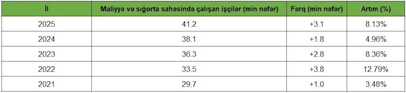 Demokrat.az valyuta.az-a istinadən xəbər verir ki, son beş ildə maliyyə və sığorta sektorunda çalışanların sayı 11,5 min nəfər və ya təxminən 38,72 faiz artaraq, 2025-ci ildə 41,2 min nəfərə çatıb.
