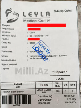 "Bundan sonra "Leyla Medical Center"ə üz tutdum. Əsas məsələ də bundan sonra başladı. Növbətçi uyğun həkim olmadığına görə həkimi evdən çağıracaqlarını bildirdilər və yerindəcə məndən "Həkimin evdən çağırışı" xidməti adı altında 100 manat ödəniş aldılar. Həmin vaxt məni kimi sınıq problemi ilə gələn 5 nəfər var idi, eyni həkimin evdən çağırılmasına görə hərəmizdən 100 manat aldılar.
